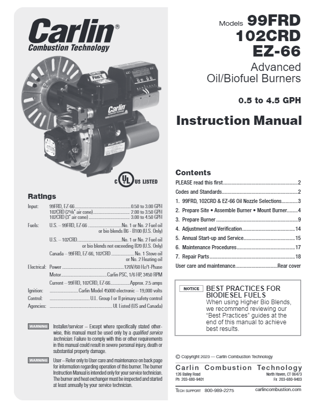 The 99FRD, 102CRD and EZ-66 residential oil burners feature Carlin’s adjustable head assembly for unmatched fuel/air mixing, smooth light-offs and quiet running. Proven for years in the field and in extensive boiler and furnace testing, these burners cover the range from residential to semi-commercial, to meet your needs for oil-burning applications.