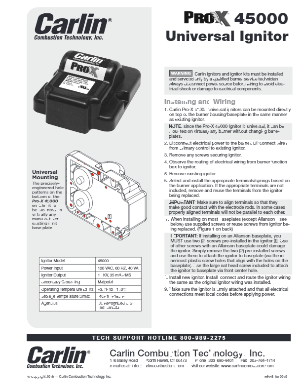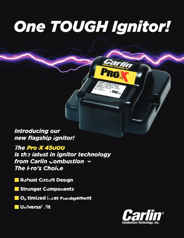 The Pro-X 45000 Universal Ignitor is Carlin’s most durable ignitor ever. Built to last and tested through hundreds of thousands of on/off cycles at high temperatures at maximum voltage, this ignitor defines durable. But long life is only half the story. The Pro-X 45000 is Universal. The rugged thermoplastic housing features mounting locations for virtually any burner, any brand. If you’re looking for a tough as nails ignitor that will fit any burner you work with, the Pro-X 45000 is for you.