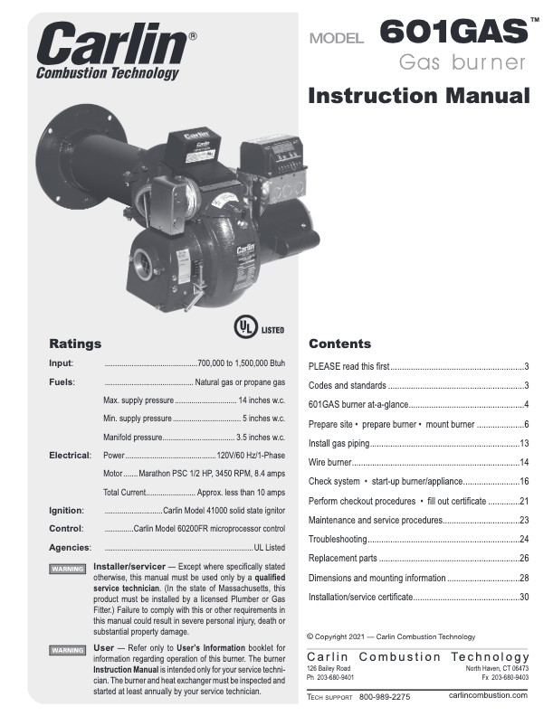 The 601GAS burner converts from propane to natural gas with just an orifice change no conversion kit needed. Fires negative or positive chambers from 700,000 to 1,500,000 Btuh input. Dependable direct-spark ignition of main flame for quick clean light offs. Time-tested solid state ignition and state-of-the-art microprocessor primary control technology.