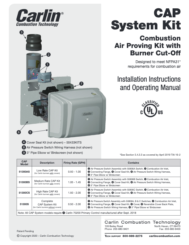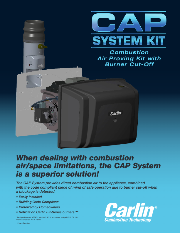 The CAP System is designed for Carlin residential oil burners. It may look like a simple outside air kit, but it’s more than that. ÔCAP’ stands for Combustion Air Proving. The CAP System monitors the outside air flowing into the burner cover. If the air should become blocked, the CAP system will safely shut down the burner. This safety mechanism allows the CAP system to meet NFPA code requirements for supplying combustion air to oil burners in most situations.