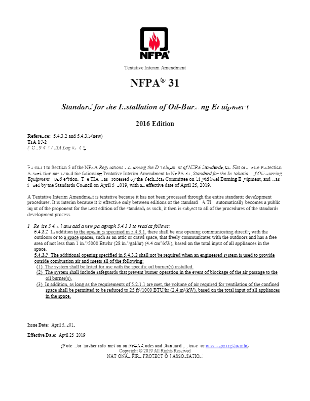 A closer look at the code requirements: NFPA-31 requires all burners installed in confined spaces be provided with combustion air. A confined space is defined as 50 cubic feet per 1000 BTU of burner input. So, an 80,000 BTU boiler -for example – would require 4,000 cubic feet of space for combustion air. If the ceiling height is 8 feet, that would be roughly 22 feet by 22 feet of empty basement. This is why so many inspectors are requiring installation of fan inducers to provide combustion air.